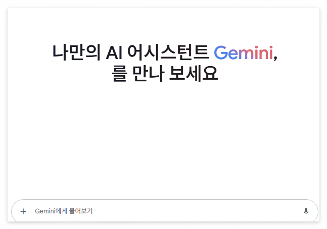 구글 제미니 무료의 메인 화면은 직관적으로 구성되어 있어, 초보자도 쉽게 사용할 수 있습니다. 화면 하단에는 '프롬프트 입력창'이 있습니다. 여기에 질문, 요청, 명령어 등을 자연스럽게 입력하면 됩니다.